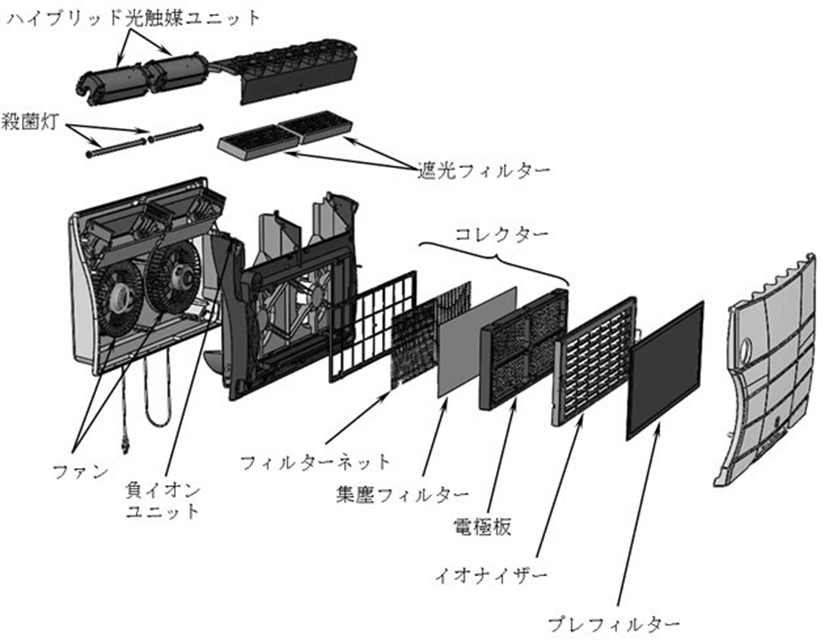 - 殺菌灯(UVC)が光触媒を活性させると同時に殺菌線で菌やウイルスを除去